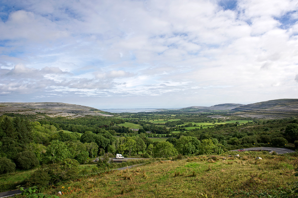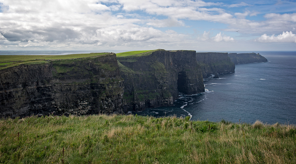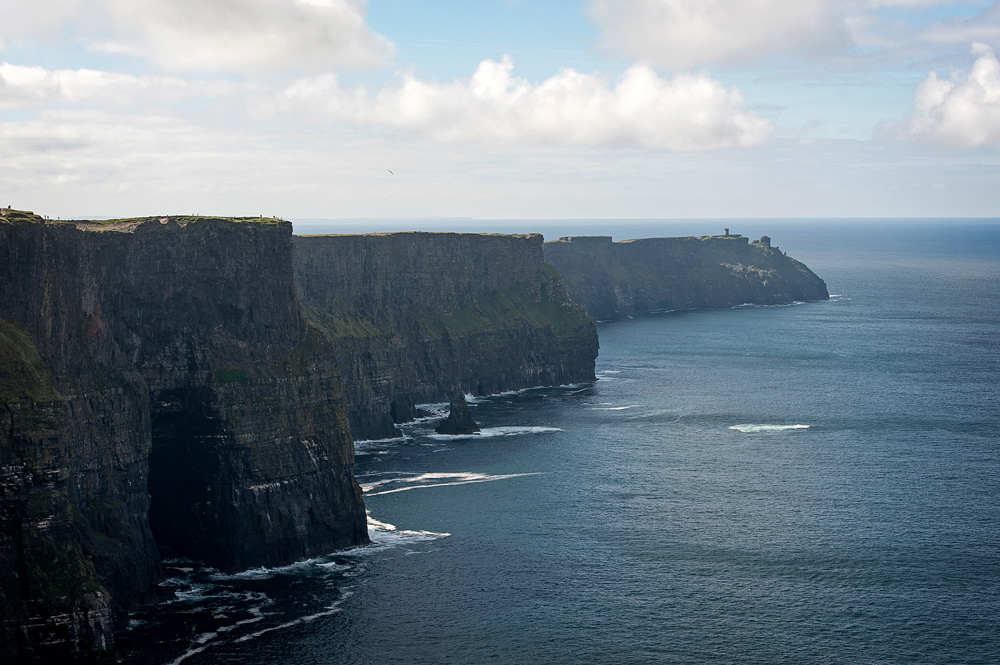The Cliffs of Moher are sea cliffs located at the southwestern edge of the Burren region in County Clare, Ireland. They run for about 14 kilometres.