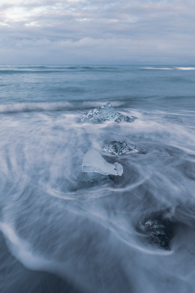 The Diamond Beach is a strip of black sand belonging to the greater Breiðamerkursandur glacial plain, located by Jökulsárlón glacier lagoon on the South Coast of Iceland. At the Diamond Beach, the icebergs which fill the Jökulsárlón glacier lagoon wash up on shore, creating a stark contrast with the volcanic black sand.
