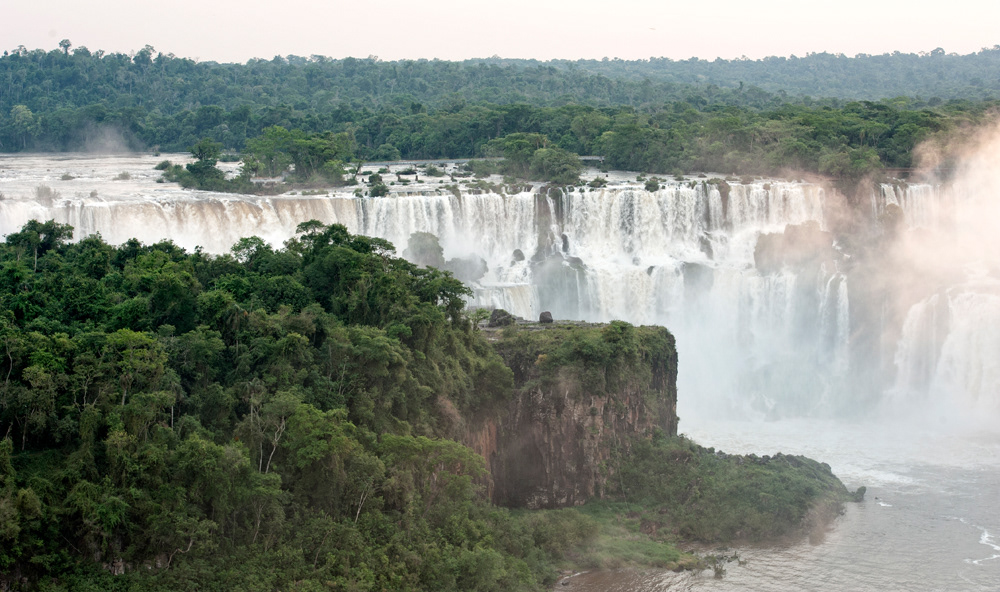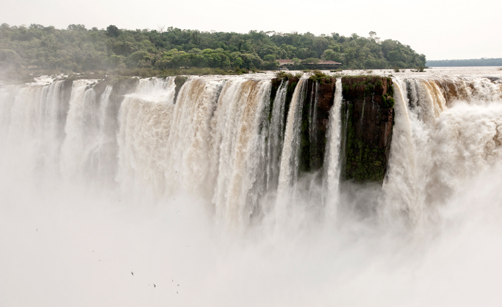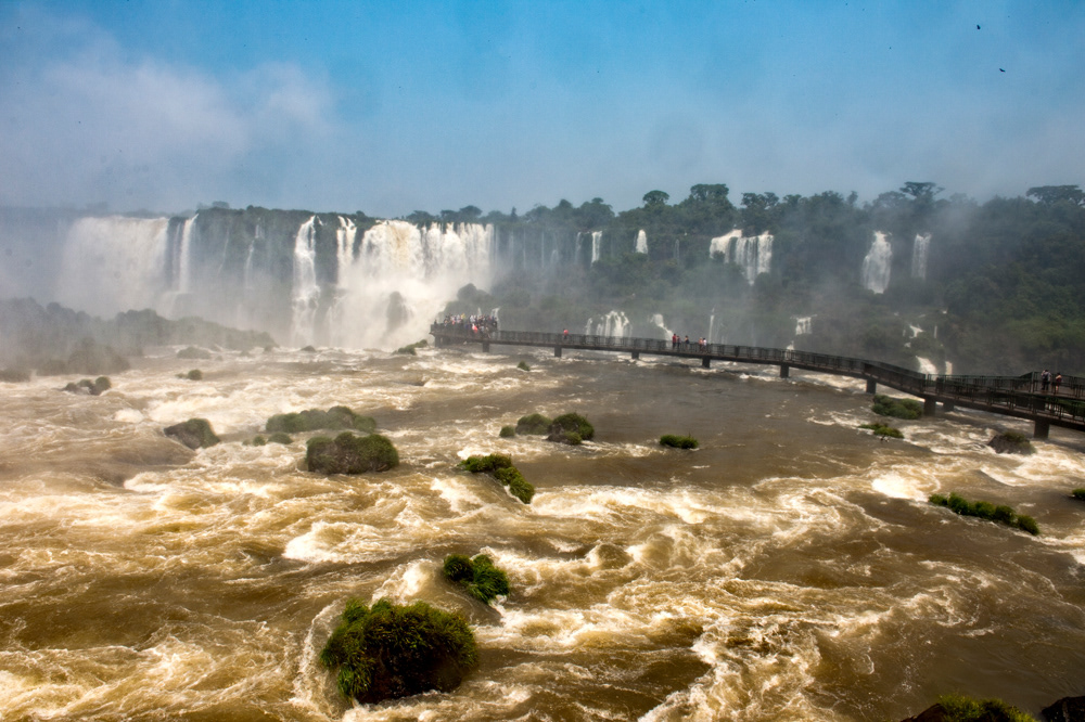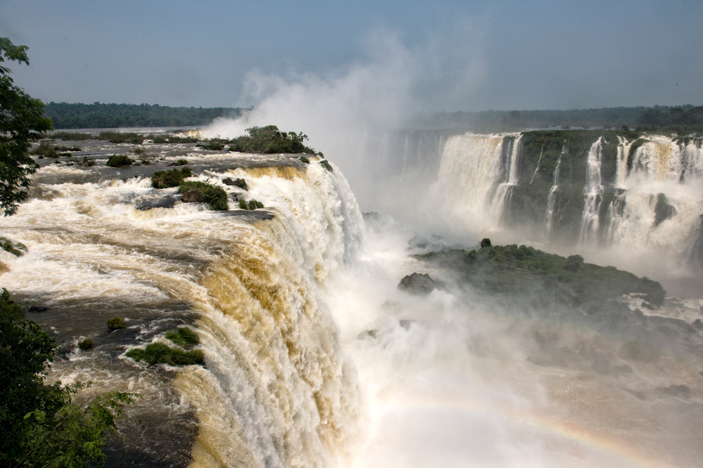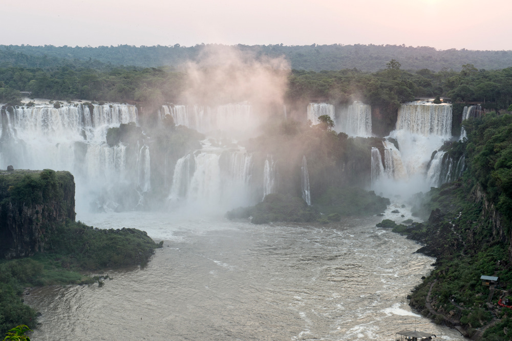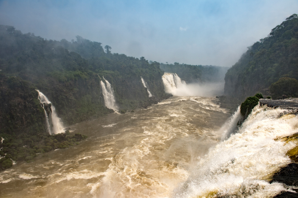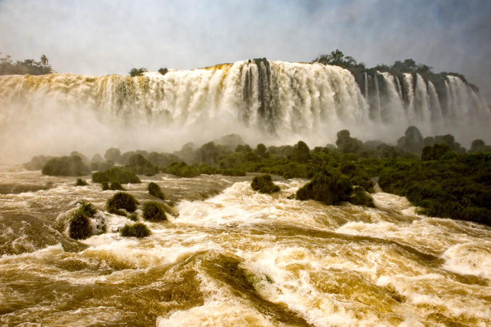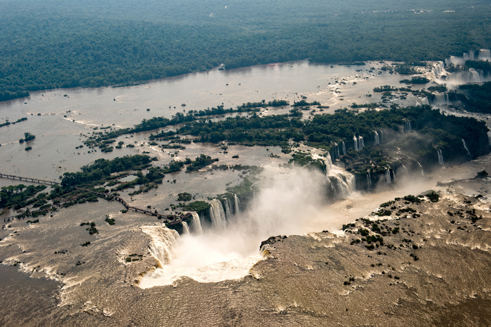 Iguazú Falls or Iguaçu Falls are waterfalls of the Iguazu River on the border of the Argentine province of Misiones and the Brazilian state of Paraná. Together, they make up the largest waterfall in the world. The falls divide the river into the upper and lower Iguazu.