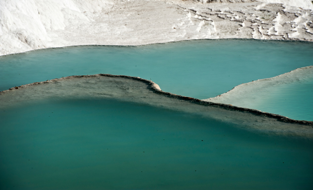 Pamukkale is a town in western Turkey known for the mineral-rich thermal waters flowing down white travertine terraces on a nearby hillside. It neighbors Hierapolis, an ancient Roman spa city founded around 190 B.C. Ruins there include a well-preserved theater and a necropolis with sarcophagi that stretch for 2km. The Antique Pool is famous for its submerged Roman columns, the result of an earthquake.