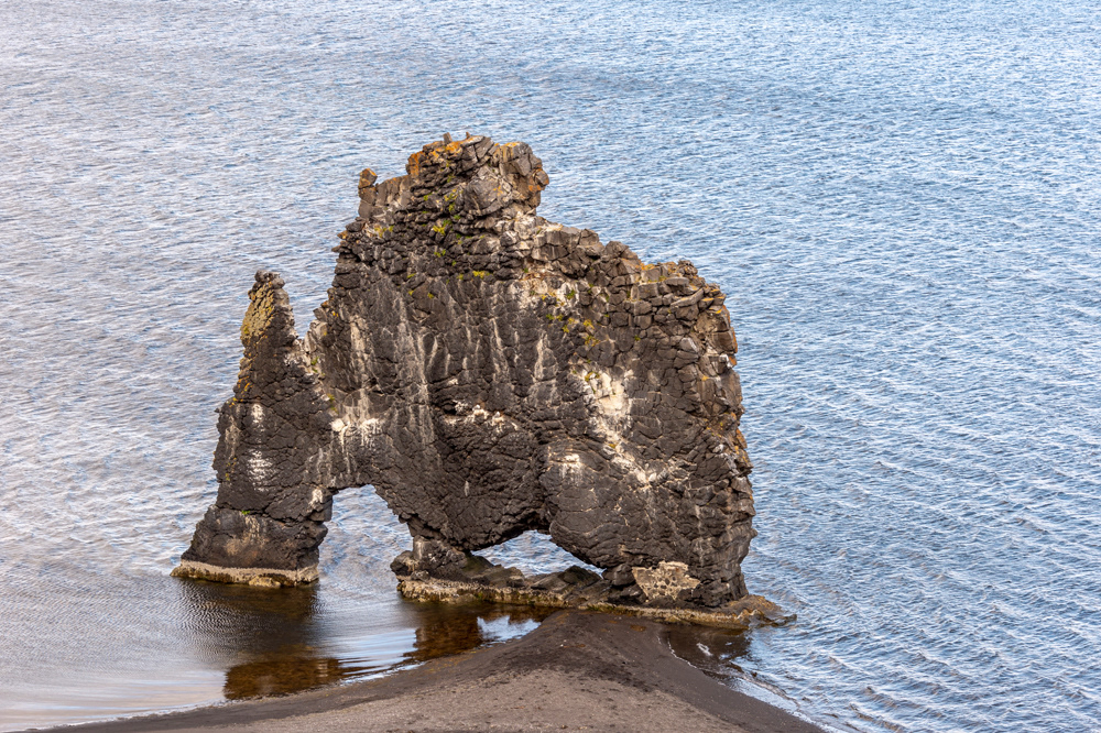 Hvítserkur is a 15 m high basalt stack along the eastern shore of the Vatnsnes peninsula, in northwest Iceland. The rock has two holes at the base, which give it the appearance of a dragon who is drinking.